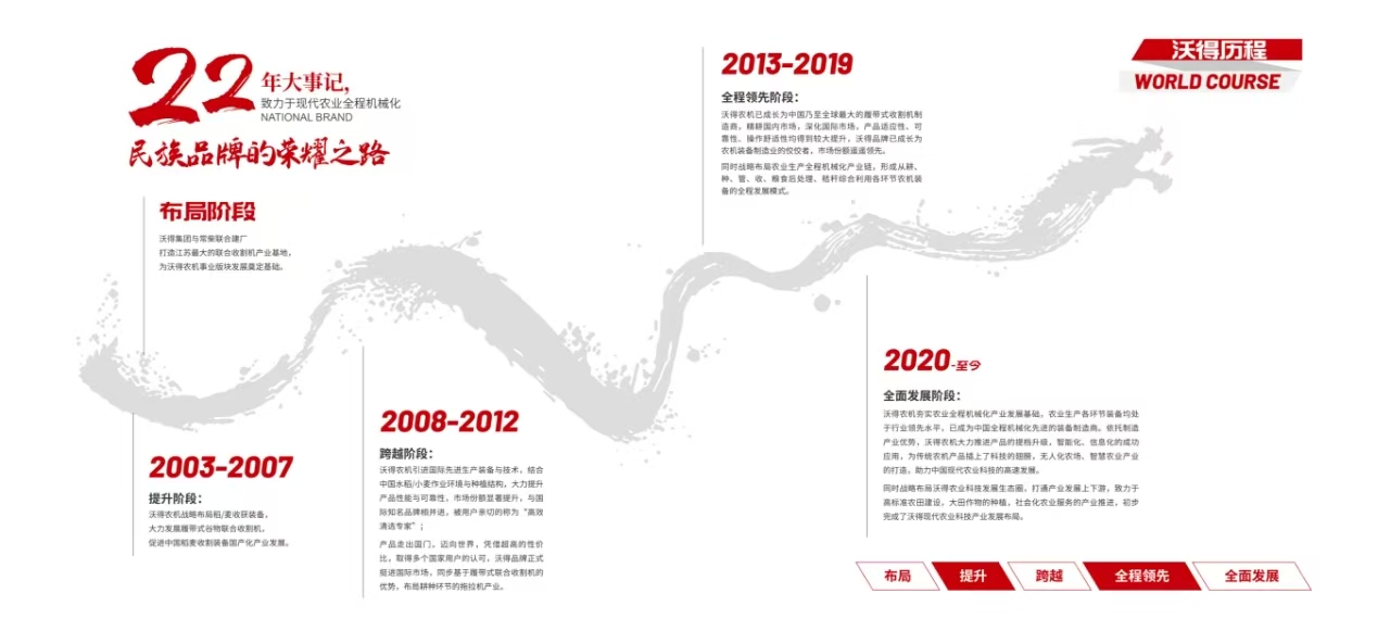 沃得農機隸屬于中國民營企業(yè)500強之一的江蘇沃得集團,占地面積3000余畝,員工8000余人,2016年實現銷售70億元人民幣,是一家集研發(fā)、生產、銷售、服務于一體的大型現代化農機裝備制造企業(yè)。沃得農機立足水田,致力于現代農業(yè)全程機械化,歷經近30年發(fā)展,產品形成以耕-種-田間管理-收獲-秸稈綜合利用-糧食后處理全系列產品線。依托優(yōu)質的產品和誠信的服務,公司產品暢銷全國28個省市自治區(qū),出口至世界38個國家和地區(qū)。